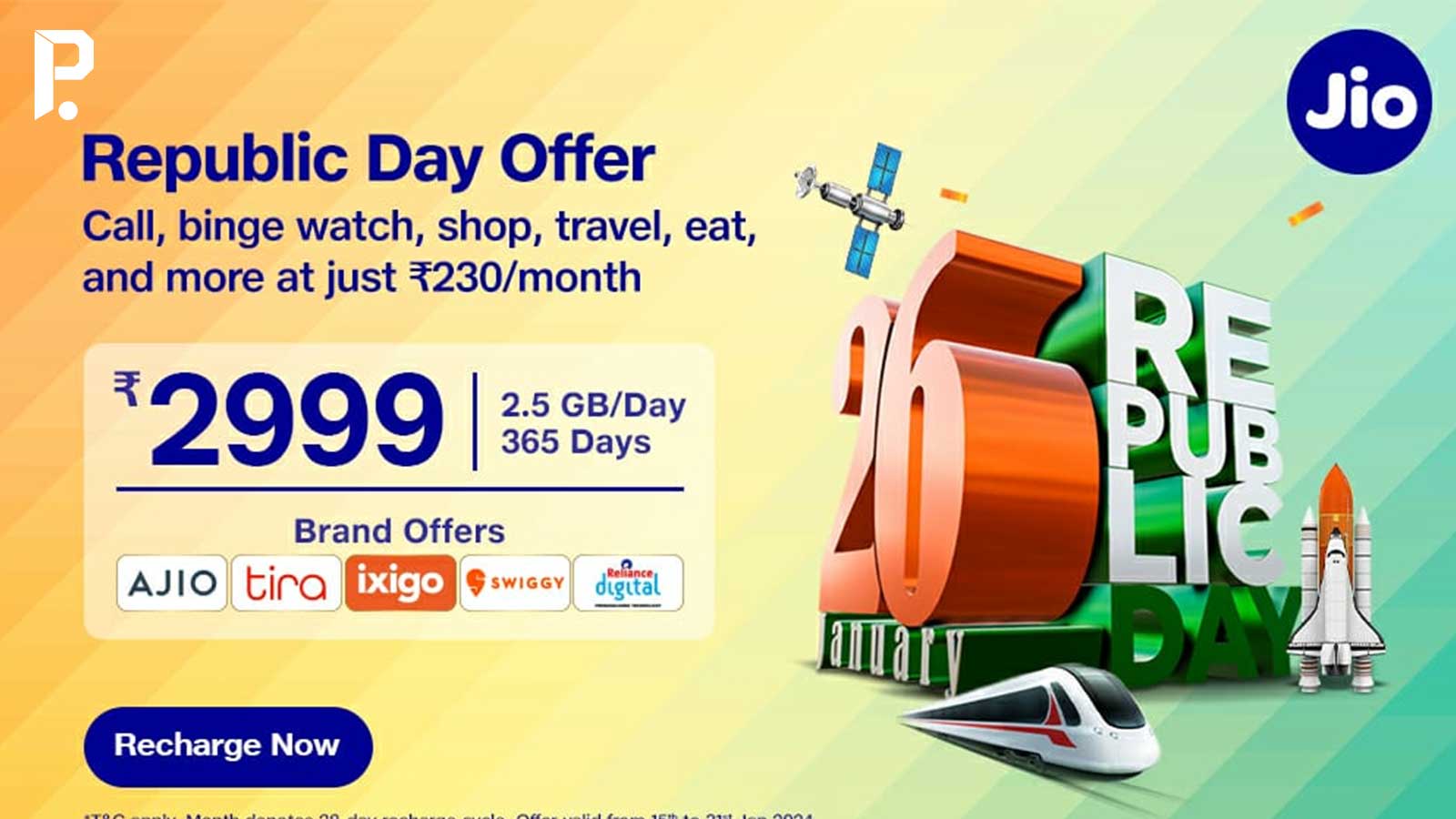 വാര്‍ഷിക പ്രീപെയ്ഡ് റീചാര്‍ജ് പ്ലാനിനൊപ്പം റിപ്പബ്ലിക് ദിന ഓഫര്‍ പ്രഖ്യാപിച്ചു ജിയോ. 2,999 രൂപ നിരക്കില്‍ ലഭ്യമാകുന്ന ഈ പ്രീപെയ്ഡ് പ്ലാനില്‍ 365 ദിവസത്തേക്ക് പ്രതിദിനം 2.5 ജിബി ഡാറ്റയും അണ്‍ലിമിറ്റഡ് വോയ്സ് കോളുകളും ലഭിക്കും. കൂടാതെ, സ്വിഗ്ഗി സബ്സ്‌ക്രിപ്ഷന്‍, അജിയോ കൂപ്പണുകള്‍, ഇക്സിഗോ വഴിയുള്ള വിമാനങ്ങളില്‍ കിഴിവുകള്‍, റിലയന്‍സ് ഡിജിറ്റലിലെ തിരഞ്ഞെടുത്ത ഉല്‍പ്പന്നങ്ങള്‍ക്ക് 10 ശതമാനം കിഴിവ് എന്നിവ പോലുള്ള അധിക ആനുകൂല്യങ്ങളും വാഗ്ദാനം ചെയ്യുന്നു. പ്രതിമാസം 230 രൂപ ചെലവിലാണ് അധിക ആനുകൂല്യങ്ങള്‍ ലഭ്യമാവുക.