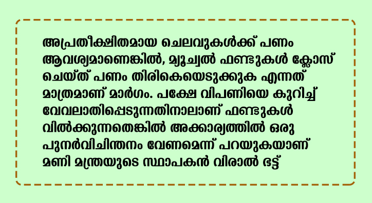 അപ്രതീക്ഷിതമായ ചെലവുകള്ക്ക് പണം ആവശ്യമാണെങ്കില്, മ്യൂച്വല് ഫണ്ടുകള് ക്ലോസ് ചെയ്ത് പണം തിരികെയെടുക്കുക എന്നത് മാത്രമാണ് മാര്ഗം. പക്ഷേ വിപണിയെ കുറിച്ച് വേവലാതിപ്പെടുന്നതിനാലാണ് ഫണ്ടുകള് വില്ക്കുന്നതെങ്കില് അക്കാര്യത്തില് ഒരു പുനര്വിചിന്തനം വേണമെന്ന് പറയുകയാണ് മണി മന്ത്രയുടെ സ്ഥാപകന് വിരാല് ഭട്ട്.