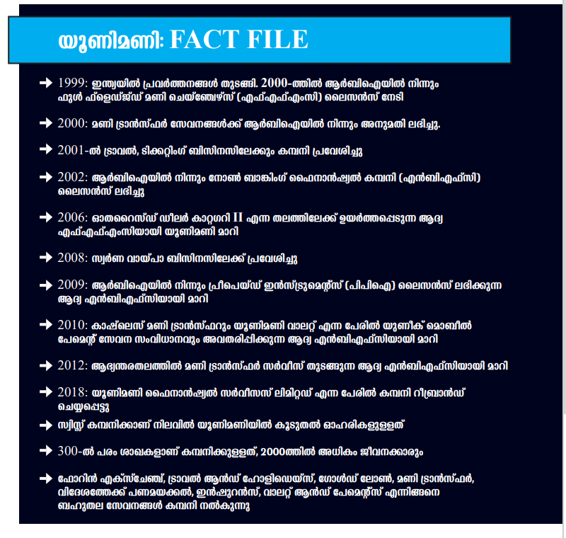 പ്രവാസി പണമിടപാടുമായി ബന്ധപ്പെട്ടുള്ള സമയദൈര്ഘ്യം ആഴ്ച്ചകളില് നിന്ന് മിനിറ്റുകളിലേക്കും സെക്കന്ഡുകളിലേക്കും കുറച്ചുവെന്നതാണ് യുഎഇ എക്സ്ചേഞ്ചായി തുടങ്ങി പിന്നീട് യൂണിമണിയായി പരിവര്ത്തനം ചെയ്യപ്പെട്ട ഈ സംരംഭത്തിന്റെ നൂതനാത്മകത. വെറും 5 ബ്രാഞ്ചുകളുമായിട്ടായിരുന്നു തുടക്കം. ഇന്ന് 300ലധികം ബ്രാഞ്ചുകളായി.