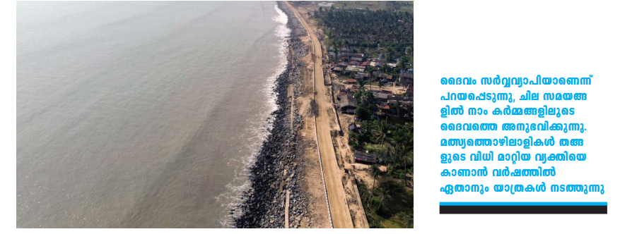 ദൈവം സര്വ്വവ്യാപിയാണെന്ന് പറയപ്പെടുന്നു, ചില സമയങ്ങളില് നാം കര്മ്മങ്ങളിലൂടെ ദൈവത്തെ അനുഭവിക്കുന്നു. മത്സ്യത്തൊഴിലാളികള് തങ്ങളുടെ വിധി മാറ്റിയ വ്യക്തിയെ കാണാന് വര്ഷത്തില് ഏതാനും യാത്രകള് നടത്തുന്നു. നന്ദിയും സ്നേഹവും വിജയകഥകളും അവര് വഹിക്കുന്നു, ഒരാള് ഒരു കാര് വാങ്ങിയതിന്റേത്, മറ്റൊരാള് കുറച്ച് സ്വര്ണം വാങ്ങിയത്, ചിലര് പുതുതായി പണിത വീട്ടിലേക്ക് മാറുകയാണ്, കുട്ടികളുടെ ഉപരിപഠനത്തിനായി ആസൂത്രണം ചെയ്യുന്നതിനെക്കുറിച്ച്. ഒരു പുഞ്ചിരിയോടെ അവര് വന്ന് അവരുടെ ക്ഷേമം പങ്കിടുമെന്നും അവരുടെ മുഖത്തെ സന്തോഷം കാണുമ്പോള് ഏതൊരു ഉദ്യോഗസ്ഥന്റെയും ഏറ്റവും വലിയ സംതൃപ്തിയാണതെന്നും അദ്ദേഹം പറഞ്ഞു.