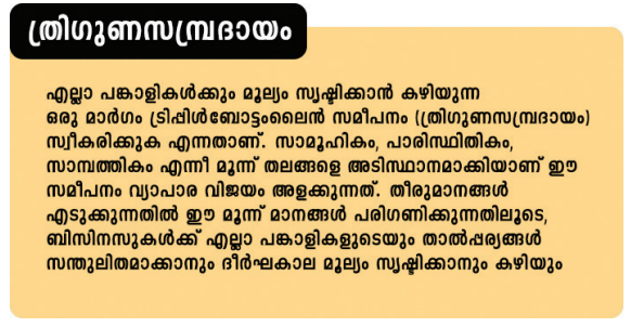വരവ്ചെലവുകളുടെ കെട്ടുപാടുകള്ക്കപ്പുറം ആസ്തിബാധ്യതകളുടെ സ്വത്ത്സമൂഹ സമവാക്യങ്ങളില്, സംതൃപ്തി എന്ന നീക്കിയിരുപ്പിന് വലിയ പ്രാധാന്യമാണ് ആധുനികകാലം കല്പ്പിക്കുന്നത്. ഒരു ബിസിനസിന്റെ സുസ്ഥിരതയ്ക്ക് സാമ്പത്തിക ലാഭം പ്രധാനമാണെങ്കിലും, അത് മാത്രമല്ല പരിഗണിക്കേണ്ടതായ ഒരേയൊരു ഘടകം. സാമൂഹികവും പാരിസ്ഥിതികവുമായ ഗുണഫലങ്ങള് സൃഷ്ടിക്കുന്നത് പോലെതന്നെ, പരിണതഫലത്തിന്റെ ആഘാതങ്ങളും ഈ കണക്കെടുപ്പുകളില് വരുന്നുണ്ട്. മുന്കാലങ്ങളില്, ഒരു ബിസിനസിന്റെ പ്രാഥമിക ലക്ഷ്യം ഓഹരി ഉടമകളുടെ വരുമാനവും മൂല്യവും വര്ദ്ധിപ്പിക്കുക എന്നതായിരുന്നു.