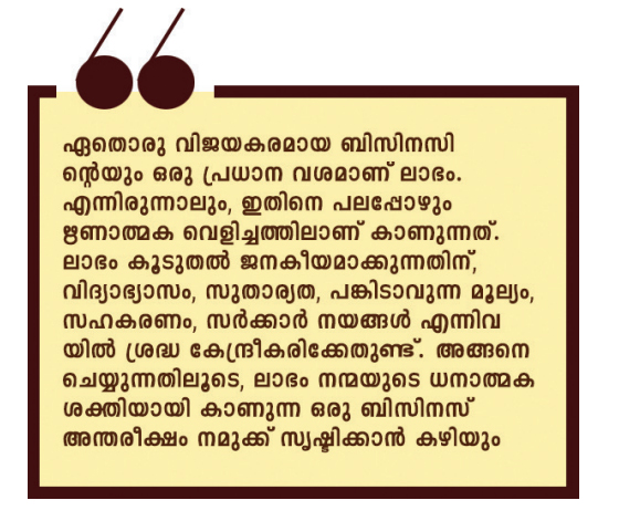 ഏതൊരു വിജയകരമായ ബിസിനസിന്റെയും ഒരു പ്രധാന വശമാണ് ലാഭം. എന്നിരുന്നാലും, ഇതിനെ പലപ്പോഴും ഋണാത്മക വെളിച്ചത്തിലാണ് കാണുന്നത്. ലാഭം കൂടുതല് ജനകീയമാക്കുന്നതിന്, വിദ്യാഭ്യാസം, സുതാര്യത, പങ്കിടാവുന്ന മൂല്യം, സഹകരണം, സര്ക്കാര് നയങ്ങള് എന്നിവയില് ശ്രദ്ധ കേന്ദ്രീകരിക്കേണ്ടതുണ്ട്. അങ്ങനെ ചെയ്യുന്നതിലൂടെ, ലാഭം നന്മയുടെ ധനാത്മക ശക്തിയായി കാണുന്ന ഒരു ബിസിനസ് അന്തരീക്ഷം നമുക്ക് സൃഷ്ടിക്കാന് കഴിയും. വാമനന് ഭൂമി ദാനം ചെയ്യാനൊരുങ്ങിയ മഹാബലിയെ കുലഗുരുവായ ശുക്രാചാര്യന് തടഞ്ഞുകൊണ്ട് പറഞ്ഞു: ‘ഈ വന്നിരിക്കുന്നത് സാക്ഷാല് വിഷ്ണുഭഗവാനാണ്. ദേവന്മാരുടെ കാര്യസാദ്ധ്യത്തിനായി, അങ്ങേയ്ക്ക് കഷ്ടം വരുത്തികൊണ്ട്, അങ്ങയുടെ സ്ഥാനത്തെയും ഐശ്വര്യത്തെയും സമ്പത്തിനെയും പ്രതാപത്തെയും കീര്ത്തിയെയും അപഹരിച്ച് അദ്ദേഹം ദേവേന്ദ്രന് കൊടുക്കും.